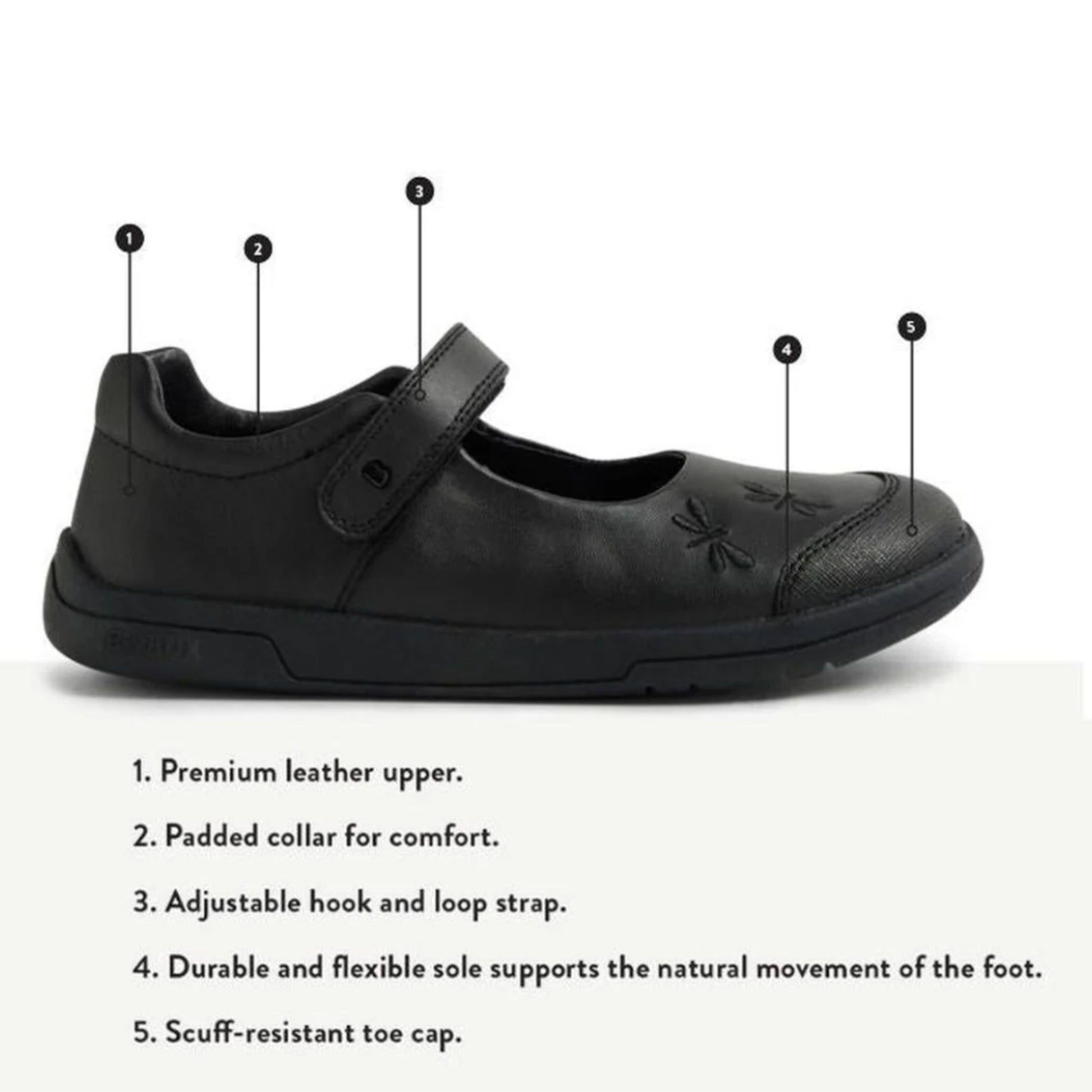 The Skipper, an iconic Mary Jane style with intricate detailing and reinforced toe-cap, is perfect for active children. Made with premium leather, these shoes offer breathable comfort. The single strap fastening allows for easy on-off and adjustability for quick mornings. And a cute dragonfly embroidery on the upper adds a sweet detail. The sole is specifically designed for everyday wear, providing comfort and durability for little feet on the playground.